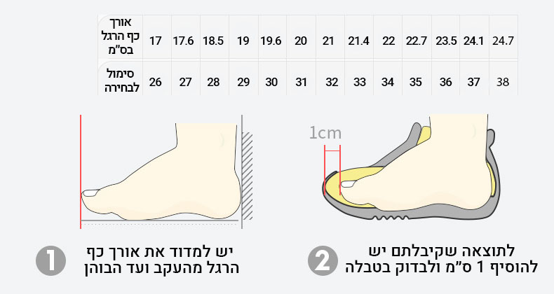 אופן בחירת המידה הנכונה: אין להסתמך על מידות וסימולים אחרים אלא רק על טבלה זו.